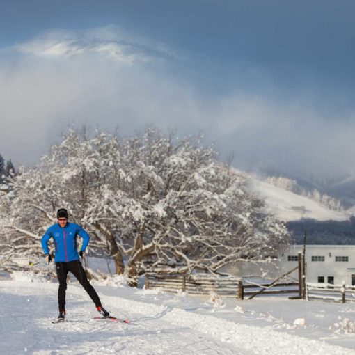 Classic skiing employs the “diagonal stride” technique, which is a fancy way of saying that you ski like you walk, with your right arm swinging forward as your left leg steps back, and vice versa. The ski stays flat on the snow and pointed straight ahead the entire time, guided by the track. Initially, you will just shuffle along, but as you improve, you will be able to glide a bit on your skis with each stride. Once you get the rhythm, it’s super smooth and graceful.